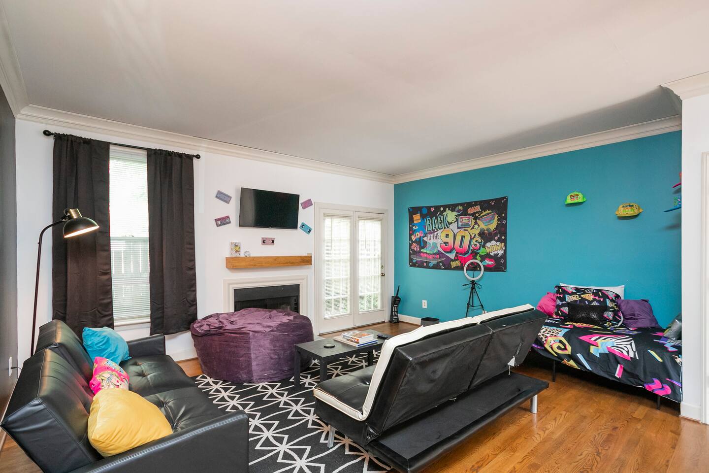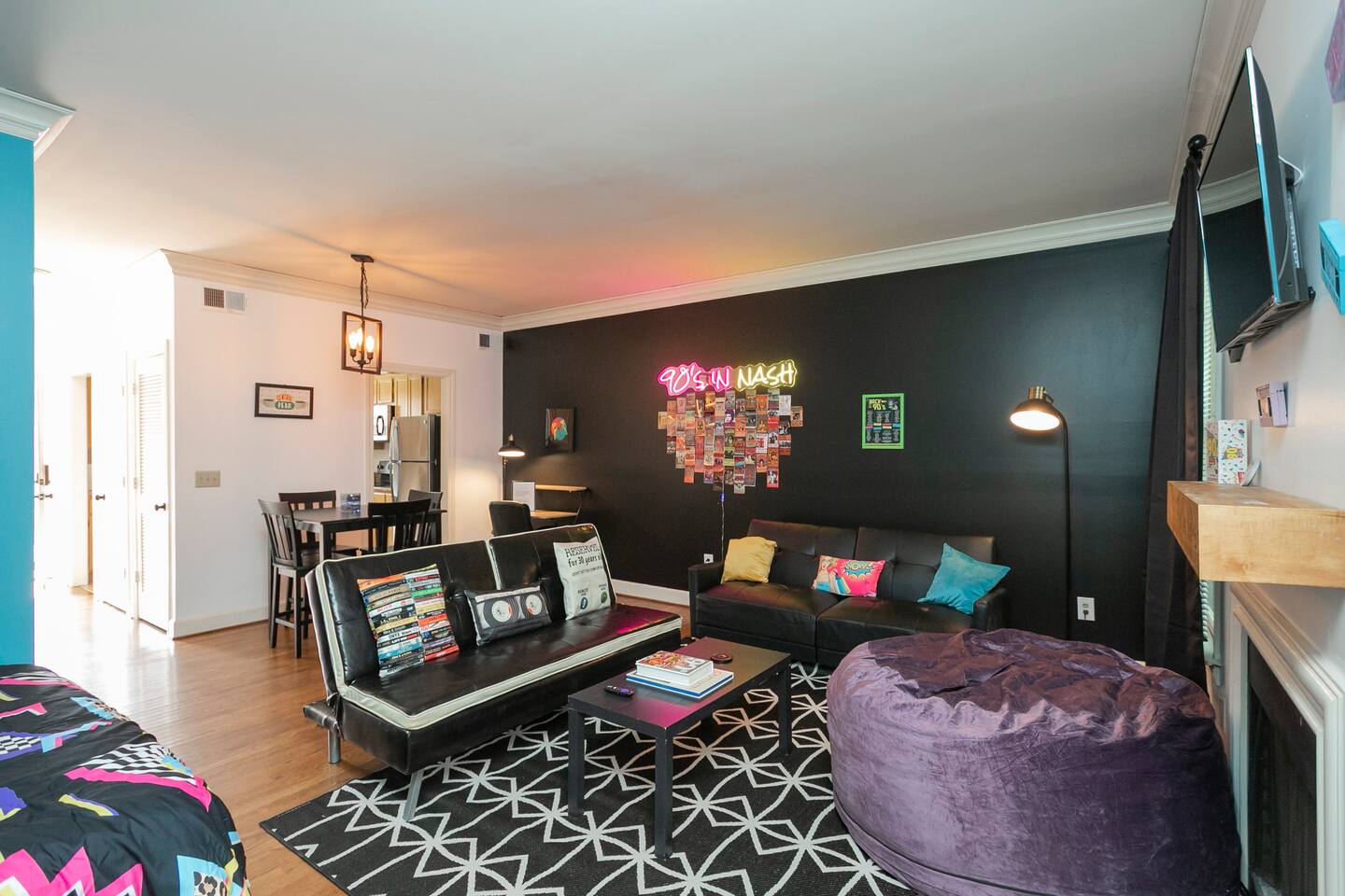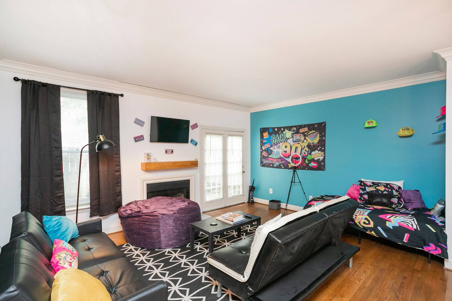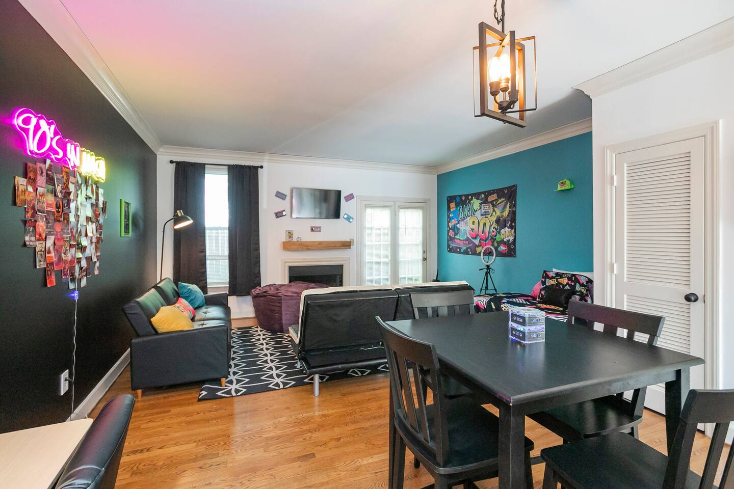 Our fav 90's nostaglia brought to life! Poster's hung up middle school style, bright colors, Saved by the Bell design mixed with a selfie wall throwing it back to large cell phones + Slater's Slating:) 1st floor: ->full kitchen ->living area with two futons and a twin bed ->4 seater dining ->1/2 bath ->outdoor patio 2nd floor: ->two queen bedrooms each with an ensuite RENOVATED bathroom!