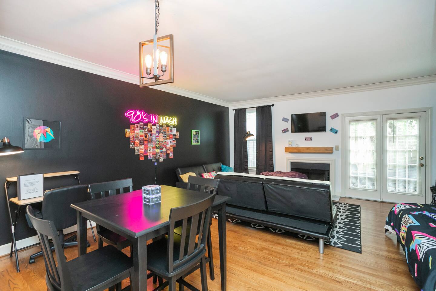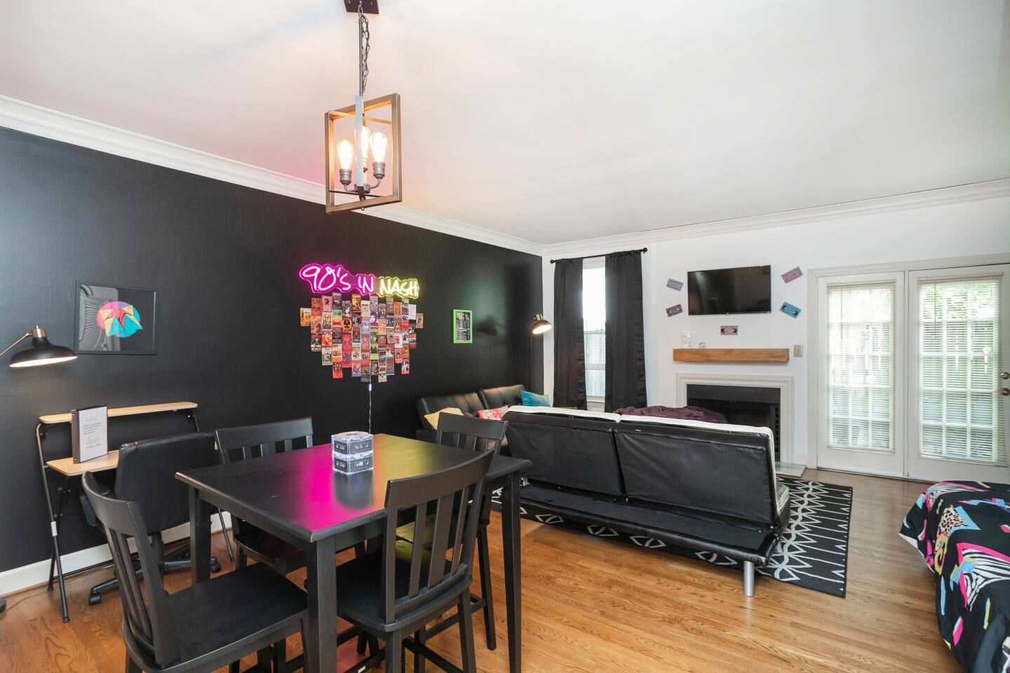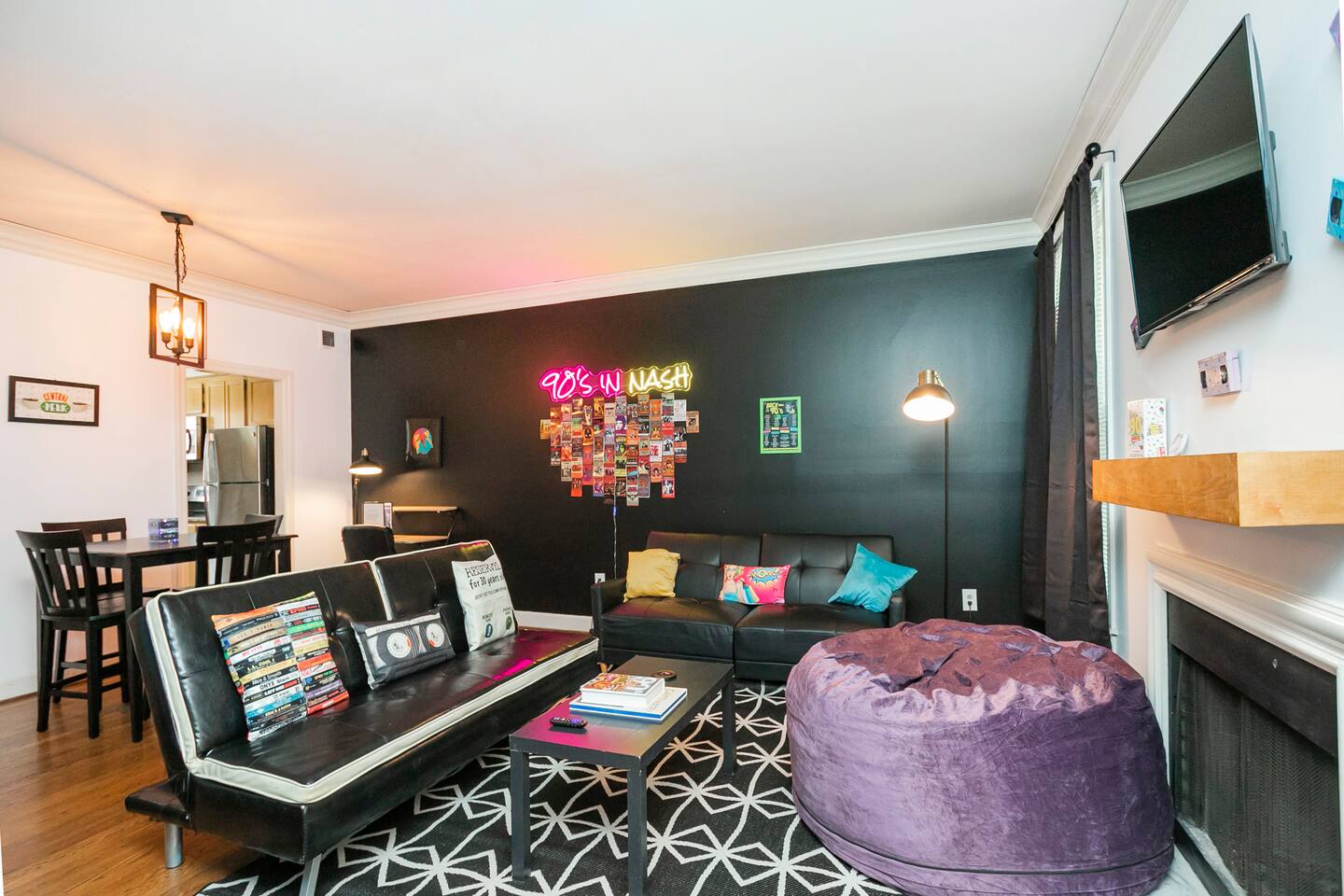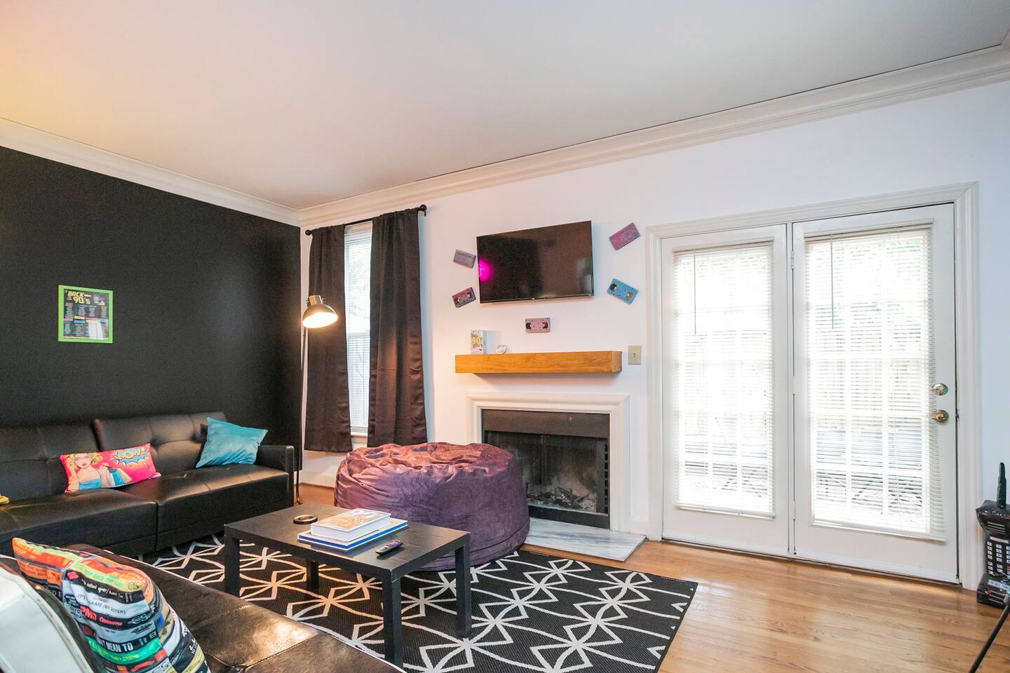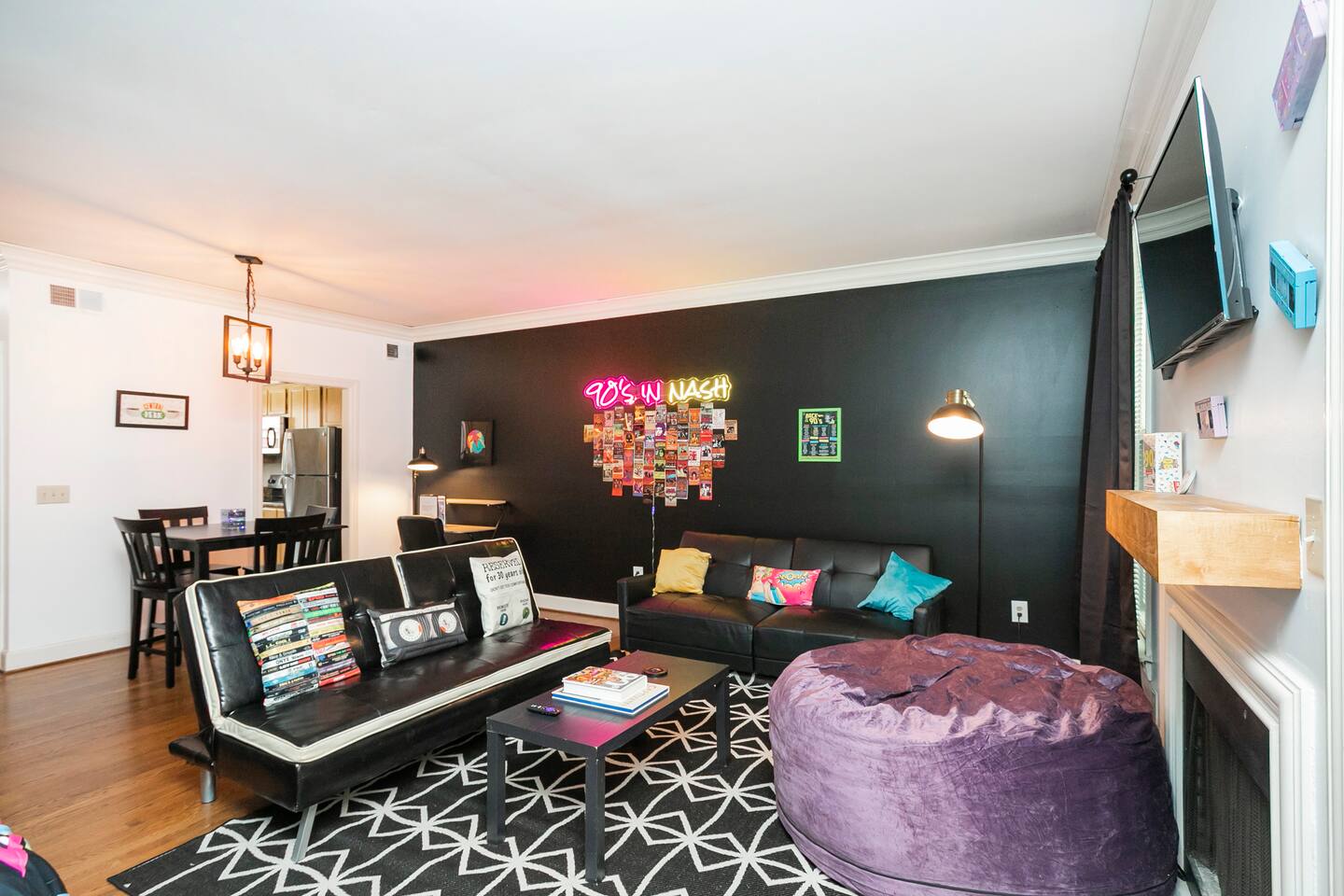 Our fav 90's nostaglia brought to life! Poster's hung up middle school style, bright colors, Saved by the Bell design mixed with a selfie wall throwing it back to large cell phones + Slater's Slating:) 1st floor: ->full kitchen ->living area with two futons and a twin bed ->4 seater dining ->1/2 bath ->outdoor patio 2nd floor: ->two queen bedrooms each with an ensuite RENOVATED bathroom!
