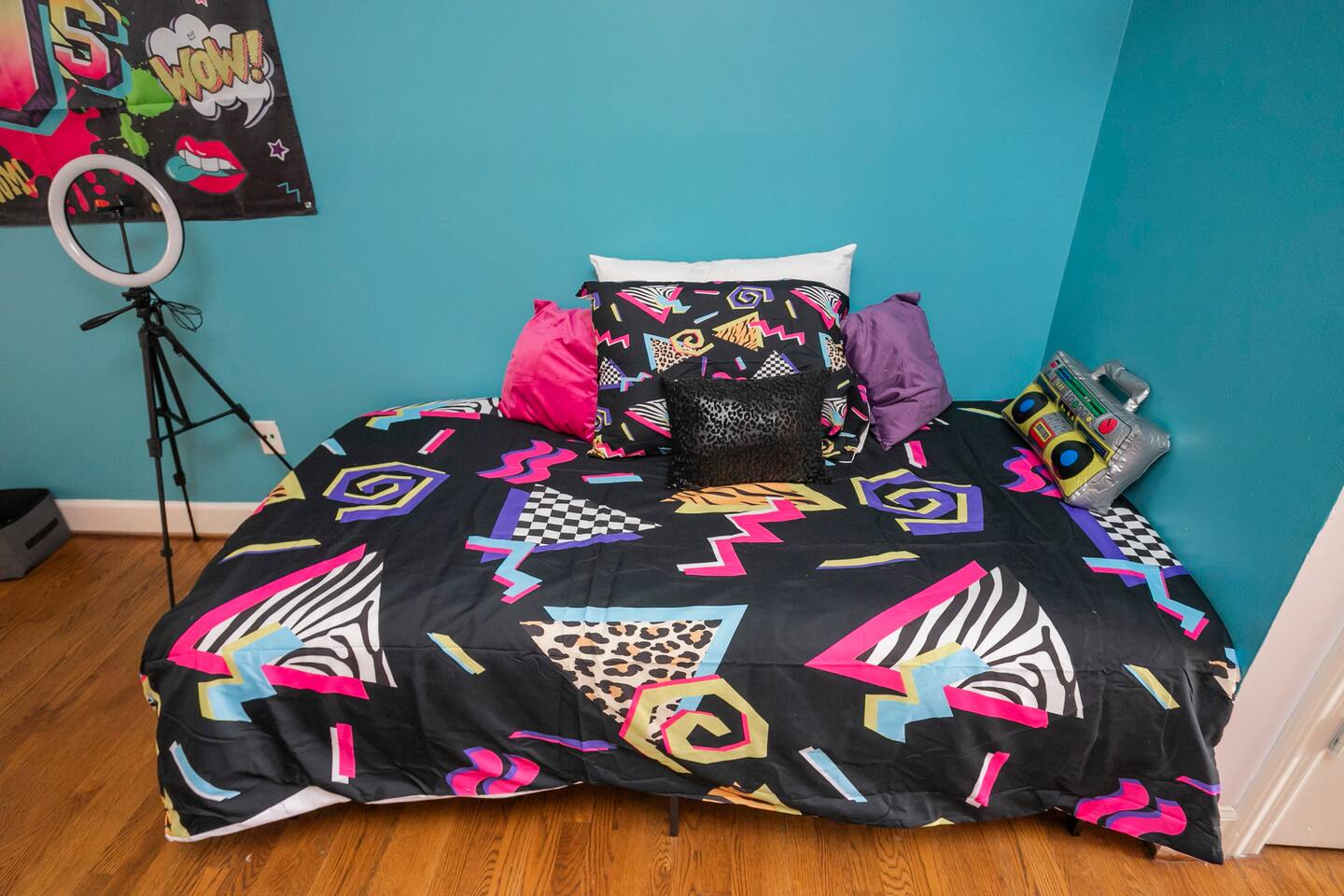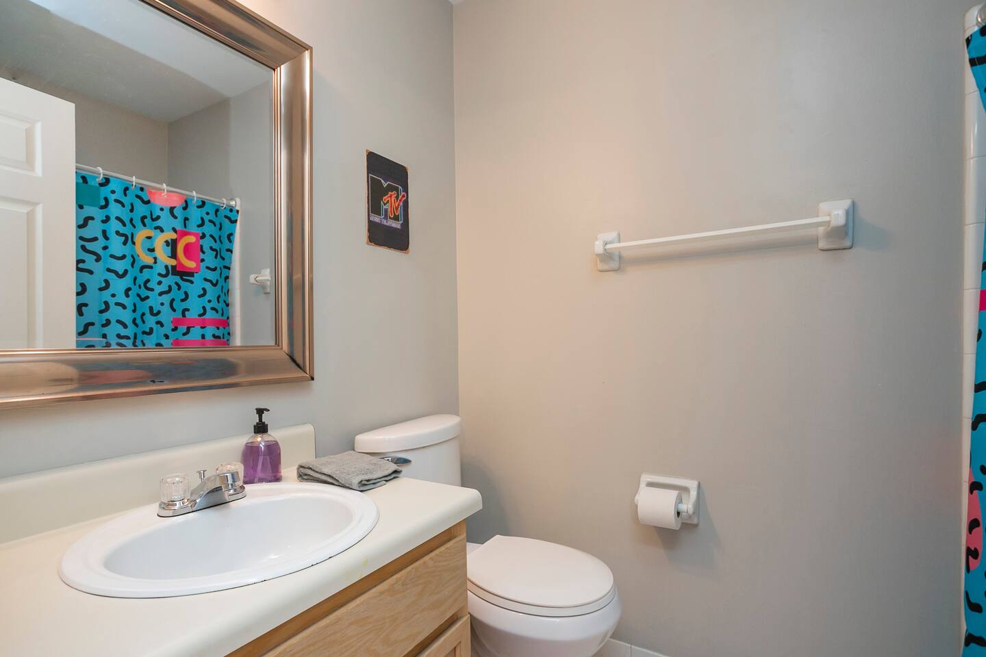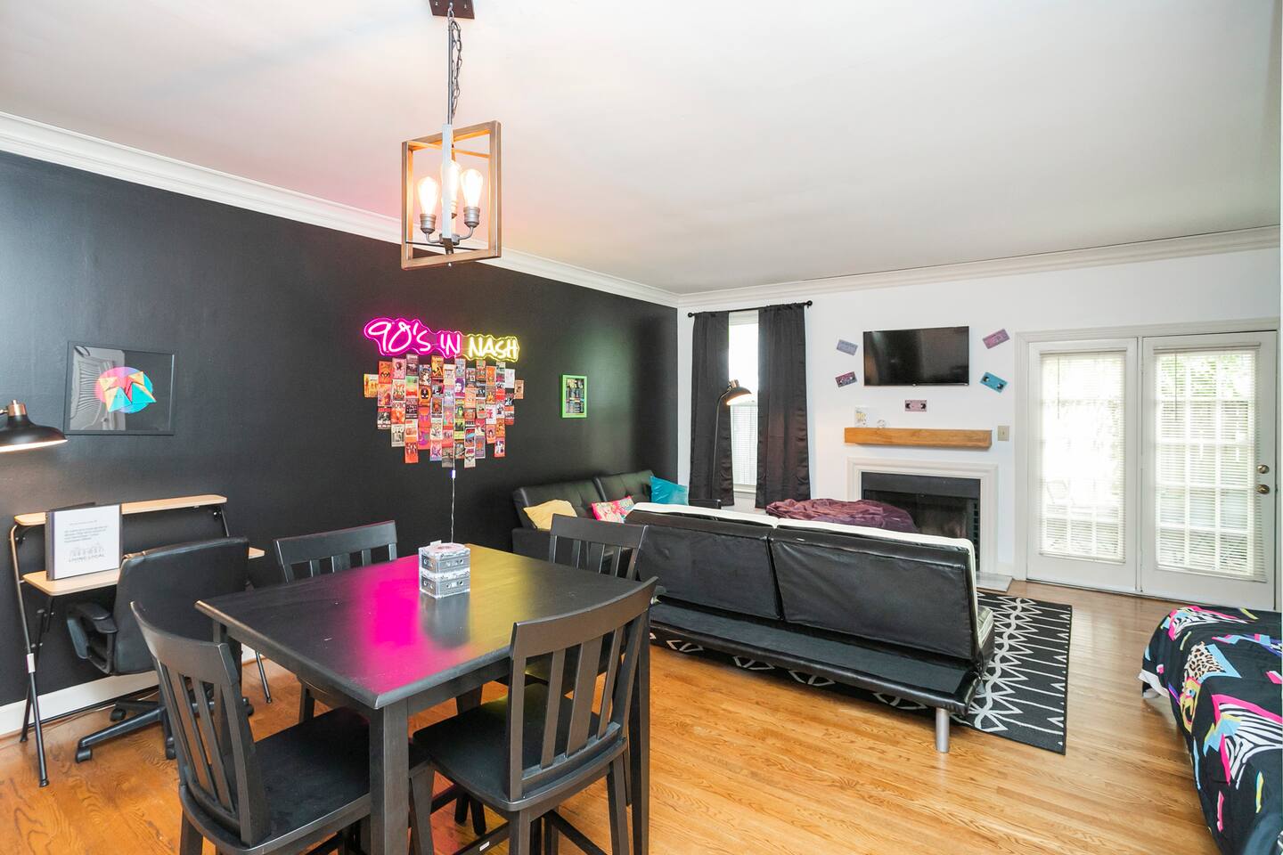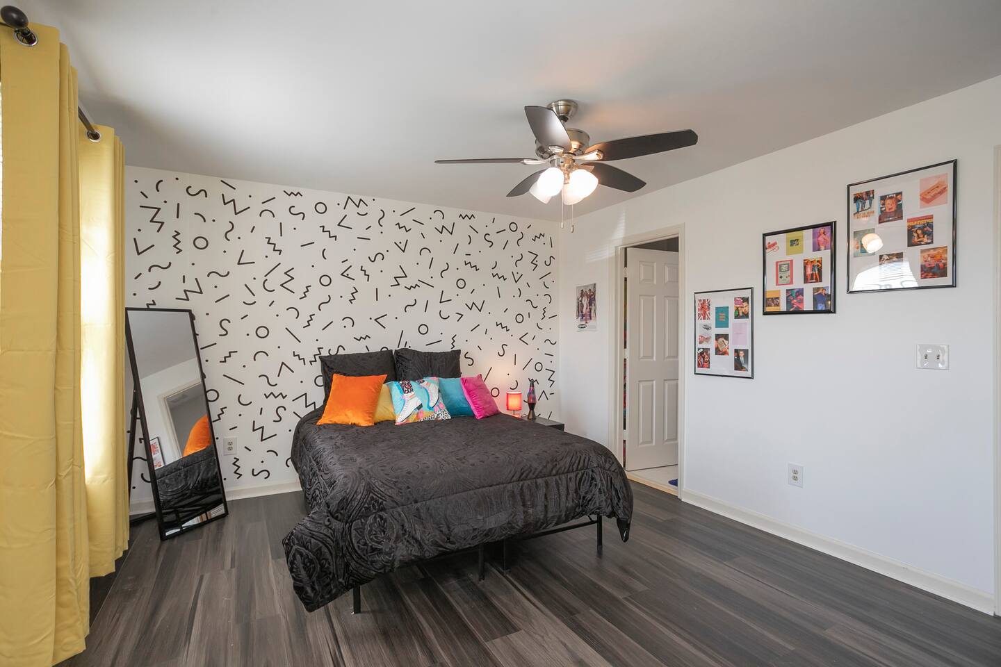 Our fav 90's nostaglia brought to life! Poster's hung up middle school style, bright colors, Saved by the Bell design mixed with a selfie wall throwing it back to large cell phones + Slater's Slating:) 1st floor: ->full kitchen ->living area with two futons and a twin bed ->4 seater dining ->1/2 bath ->outdoor patio 2nd floor: ->two queen bedrooms each with an ensuite RENOVATED bathroom!
