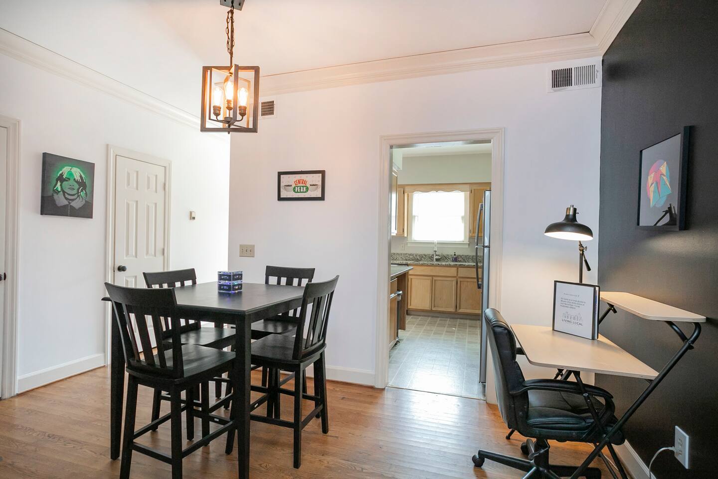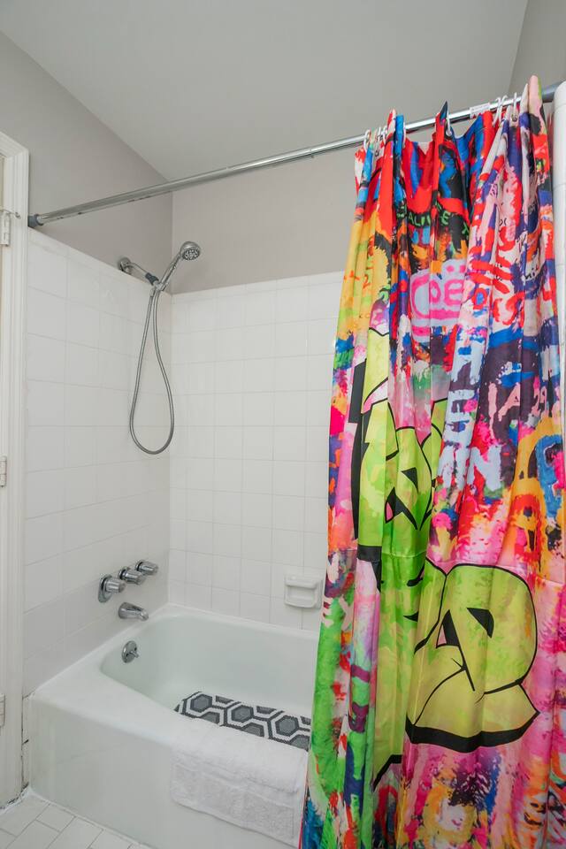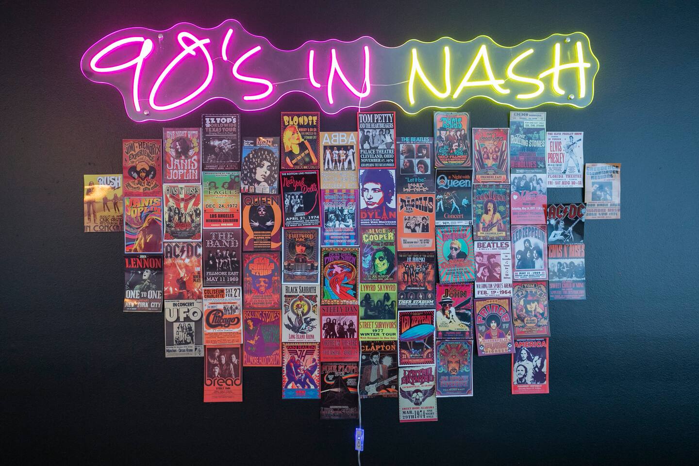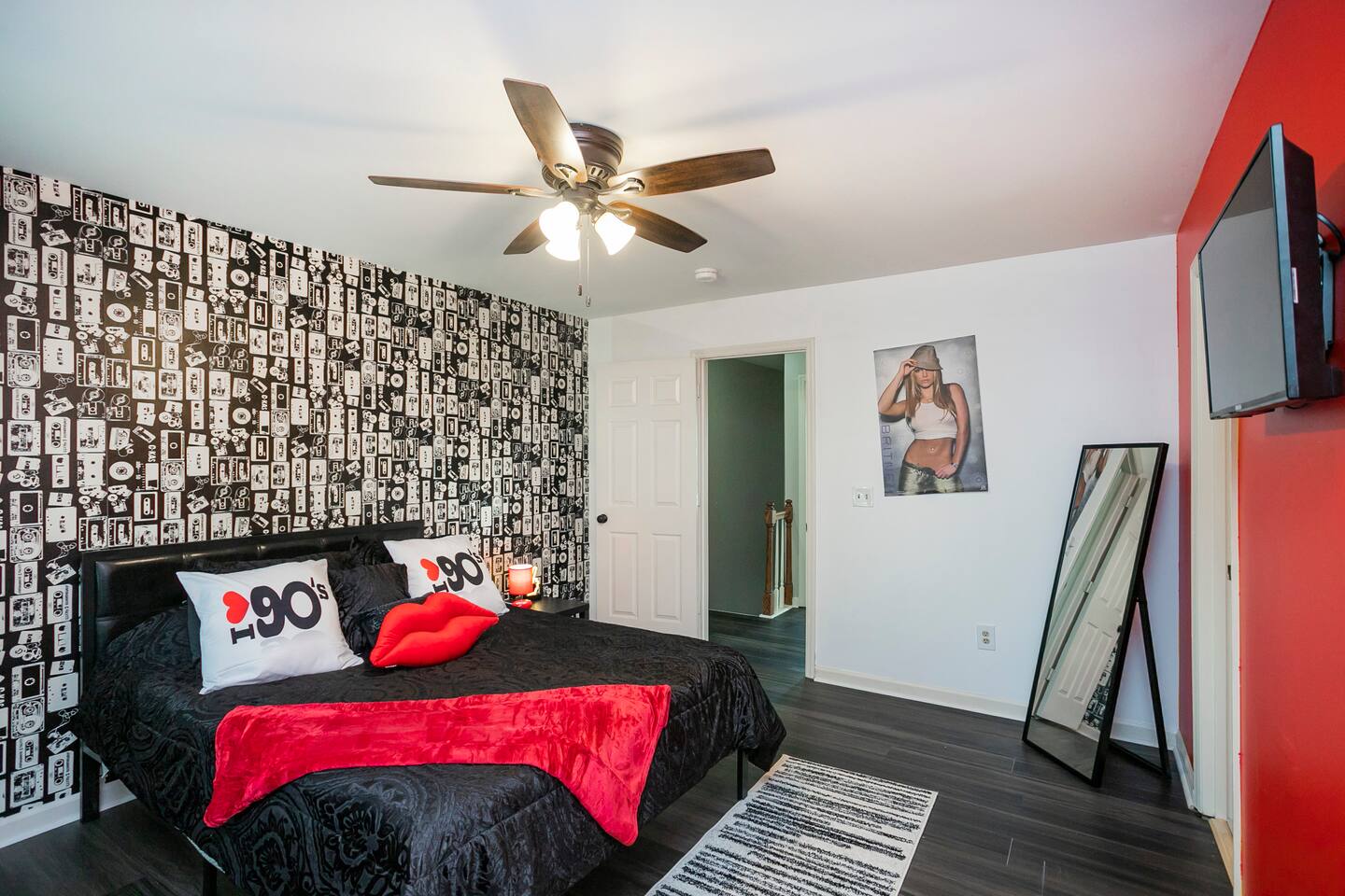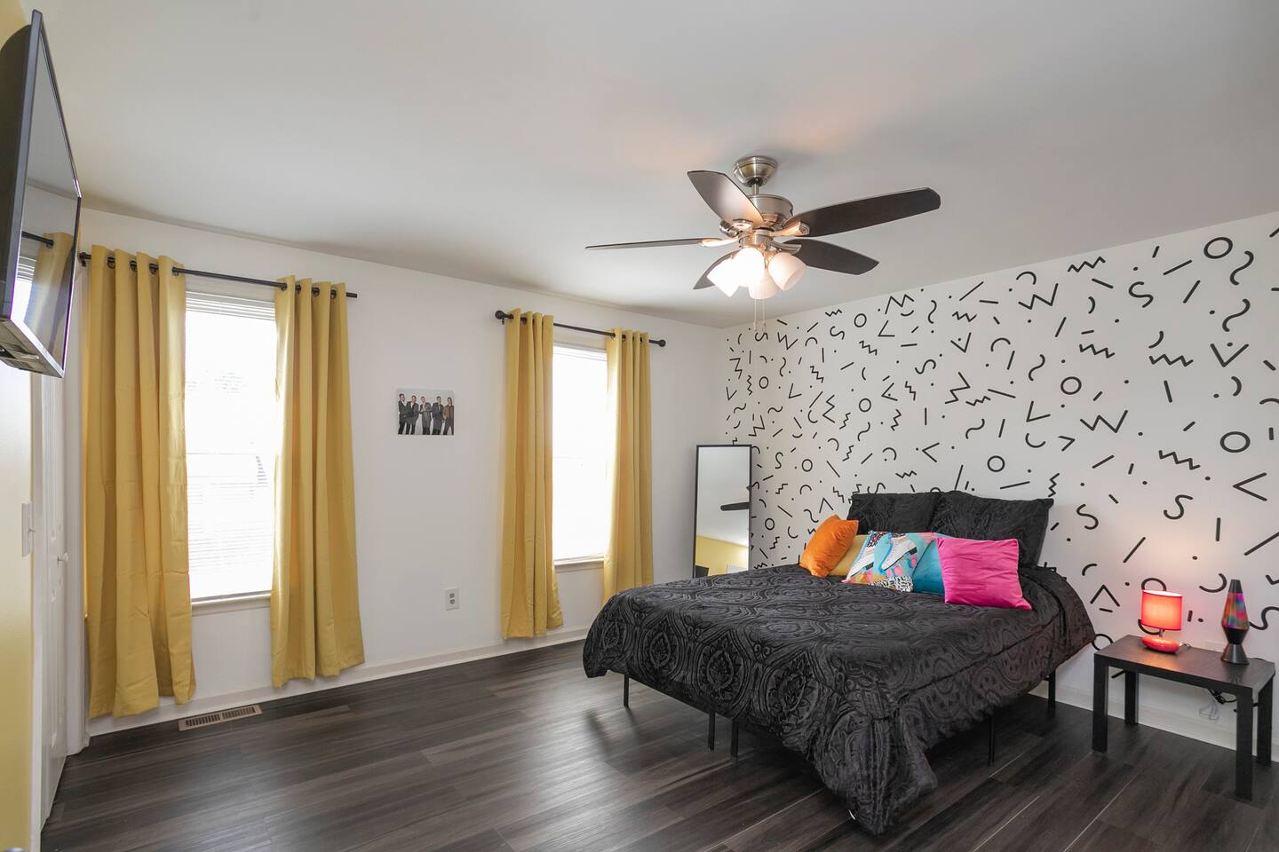 Our fav 90's nostaglia brought to life! Poster's hung up middle school style, bright colors, Saved by the Bell design mixed with a selfie wall throwing it back to large cell phones + Slater's Slating:) 1st floor: ->full kitchen ->living area with two futons and a twin bed ->4 seater dining ->1/2 bath ->outdoor patio 2nd floor: ->two queen bedrooms each with an ensuite RENOVATED bathroom!
