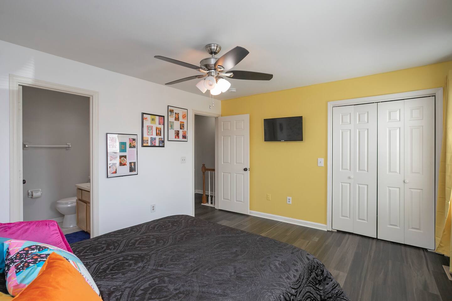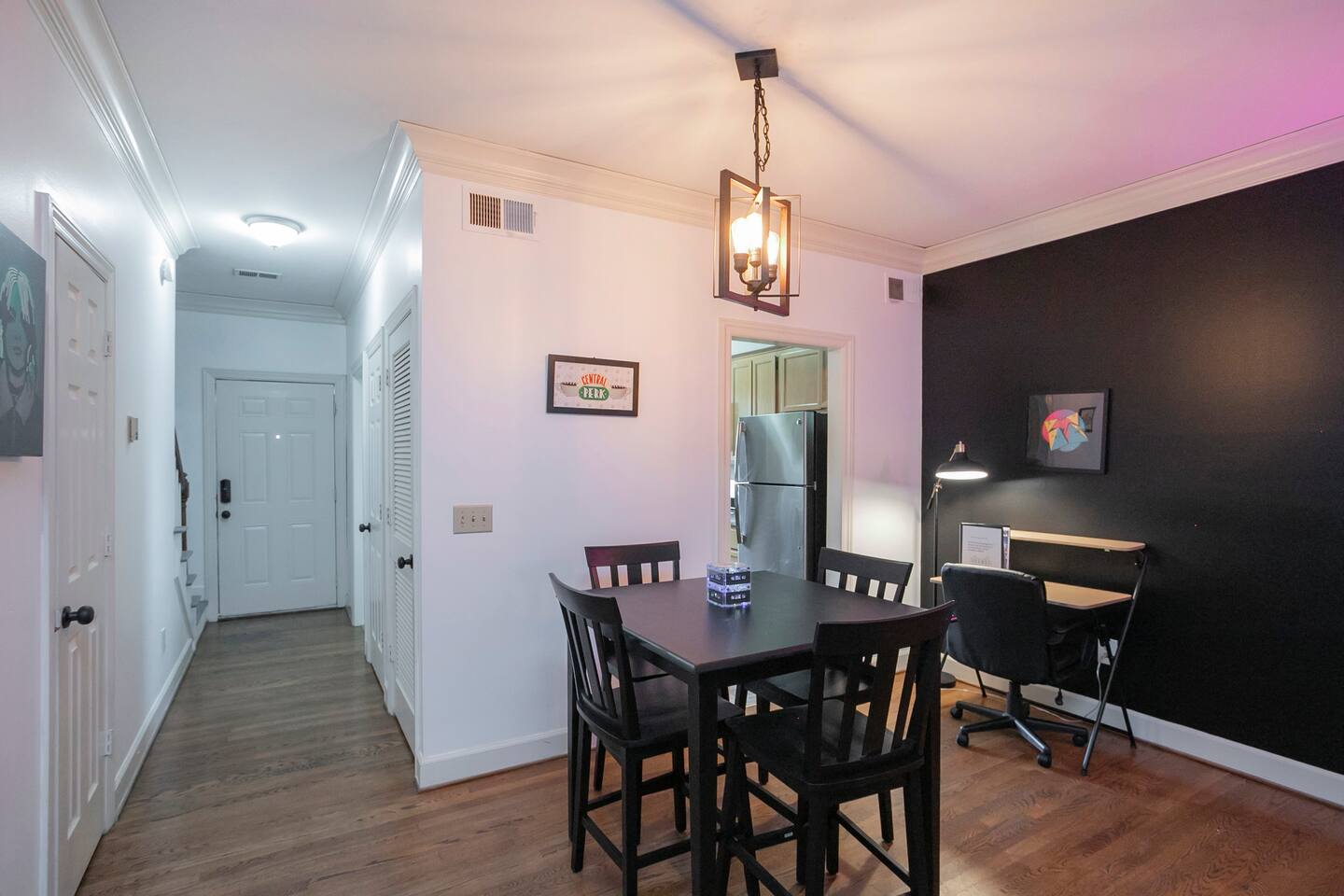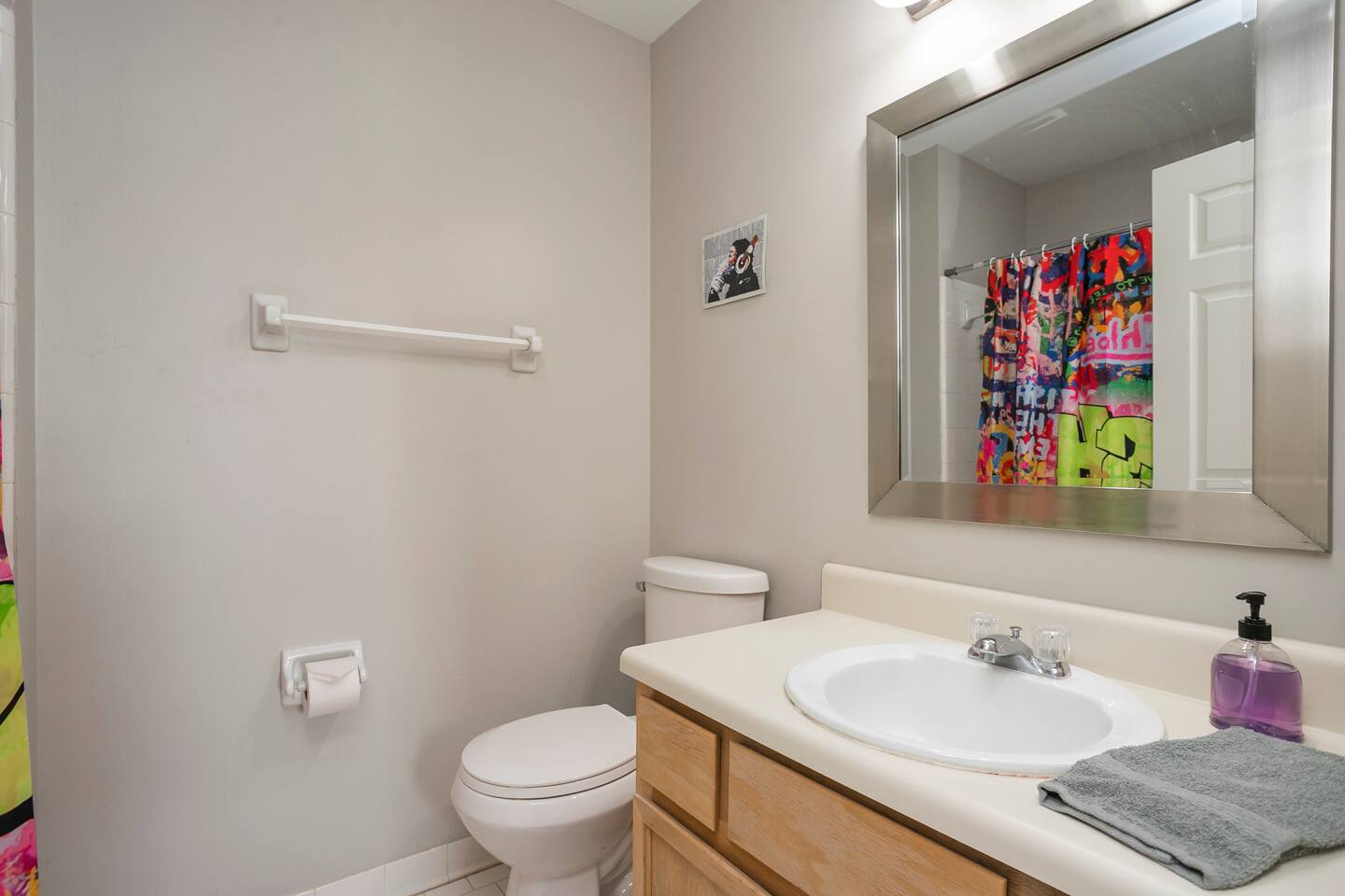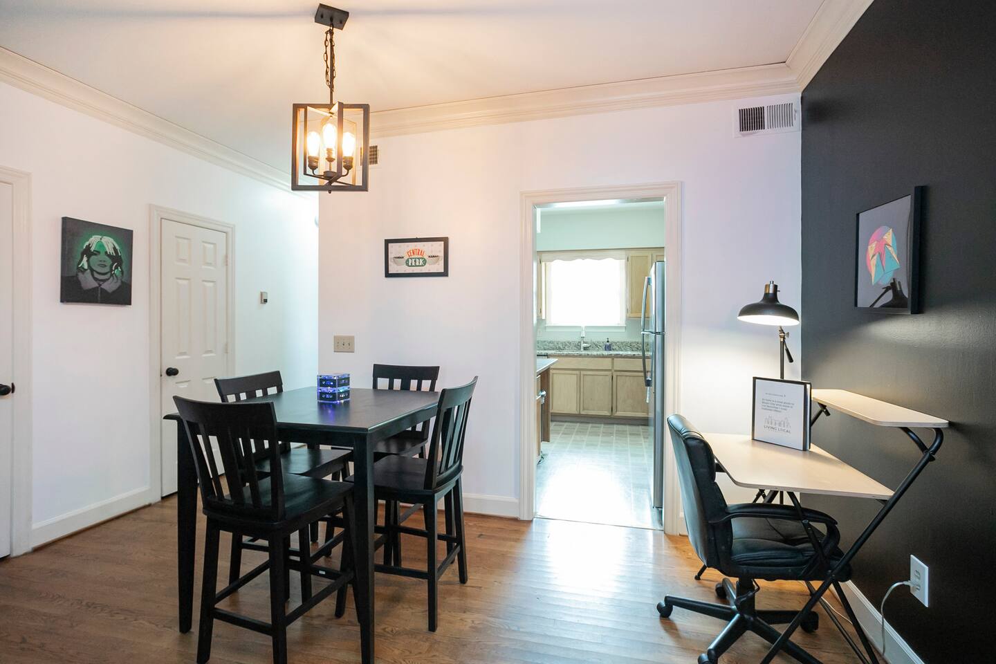 Our fav 90's nostaglia brought to life! Poster's hung up middle school style, bright colors, Saved by the Bell design mixed with a selfie wall throwing it back to large cell phones + Slater's Slating:) 1st floor: ->full kitchen ->living area with two futons and a twin bed ->4 seater dining ->1/2 bath ->outdoor patio 2nd floor: ->two queen bedrooms each with an ensuite RENOVATED bathroom!
